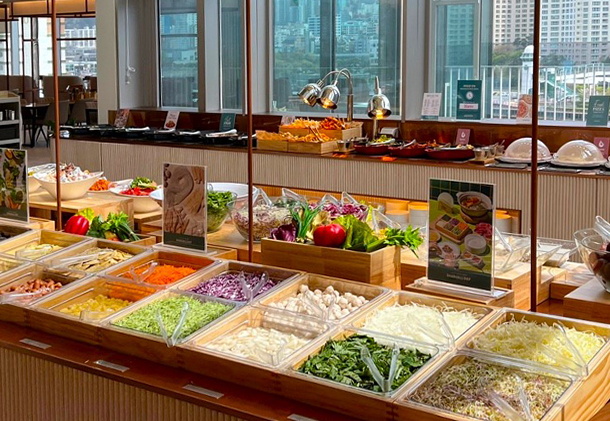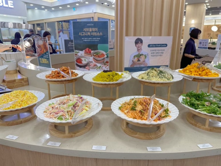 샤브올데이 평일 점심 시간대에도 샐러드바의 모든 메뉴를 이용할 수 있어요. 신선한 채소와 과일, 김치, 샐러드 드레싱, 소스류가 다양하게 준비되어 있답니다. 샐러드바에는 양상추, 로메인, 양배추, 당근, 파프리카, 브로콜리 등 신선한 채소가 가득해요.