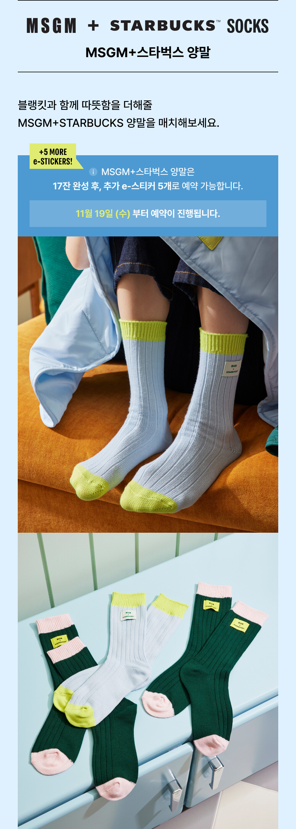 기본 스타벅스 겨울 이프리퀀시를 완료한 후 음료 5잔을 추가로 구매하면 MSGM 협업 양말 또는 파우치를 예약할 수 있습니다. 그린과 스카이 블루 두 가지 컬러로 제공되며, 크리스마스 시즌의 특별한 분위기를 담은 디자인이 특징입니다.