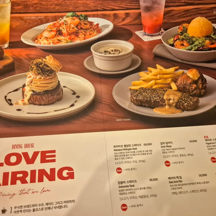 아웃백의 대표 메뉴인 짐붐바 스테이크는 채끝등심으로 부드럽고 맛있습니다. 미디엄 굽기로 주문하면 육즙이 풍부하면서도 적당히 익어 최상의 맛을 즐길 수 있어요. 바비큐 소스가 스테이크와 완벽한 조화를 이루어 더욱 맛있습니다.