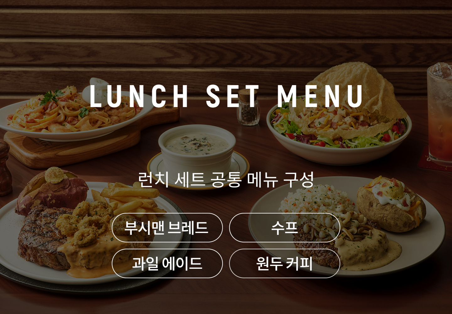 메인 요리와 함께 스프(또는 샐러드로 변경 가능), 에이드, 커피가 기본 포함됩니다. 또한 사이드 메뉴 2가지를 선택할 수 있습니다.